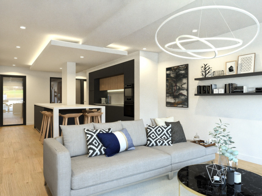 L’appartement dispose d’un vaste séjour lumineux de plus de 40 m² avec cuisine ouverte, ouvrant sur une terrasse plein sud de 46 m² avec vue panoramique sur la mer, la piscine à débordement et les îles de Lérins. Trois chambres dont une suite parentale avec salle d’eau privative permettent d’accueillir famille ou invités dans un excellent confort.