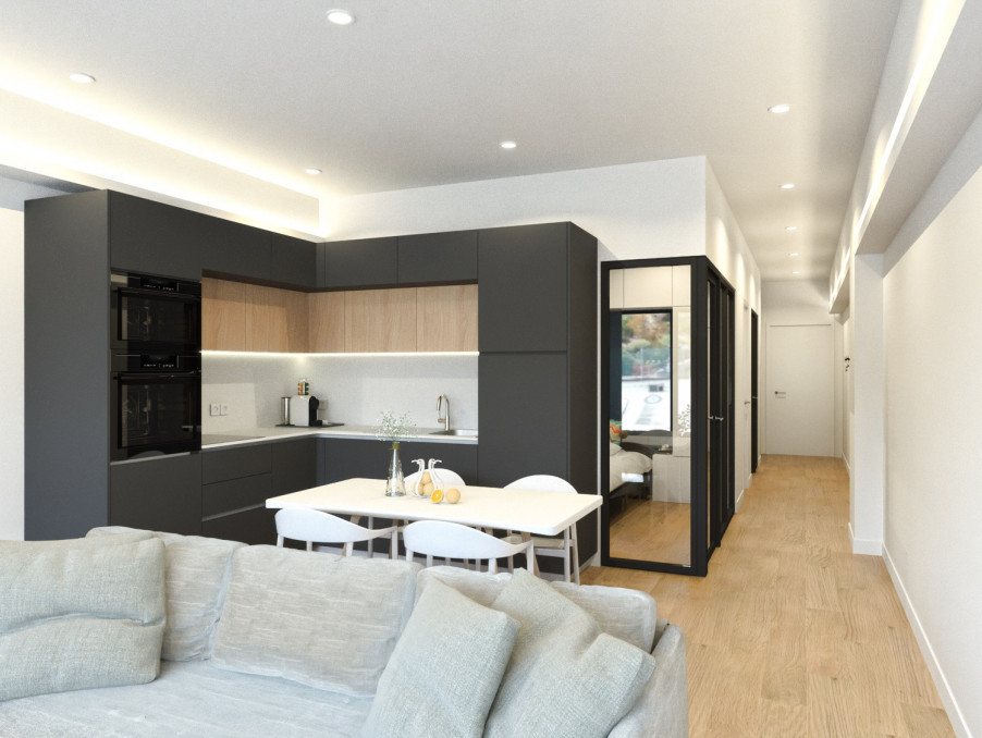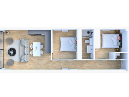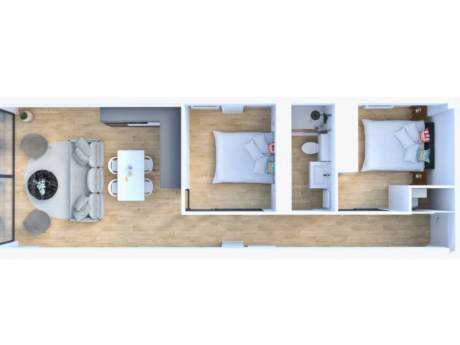 L’espace de vie se compose d’un séjour lumineux (22,69m2) avec cuisine ouverte haut de gamme, deux chambres confortables, une salle de bains moderne, un local technique/buanderie, et de nombreux rangements. L’ensemble a été conçu dans un esprit design et fonctionnel : menuiseries aluminium, éclairage LED, cuisine équipée, mobilier intégré (en option).