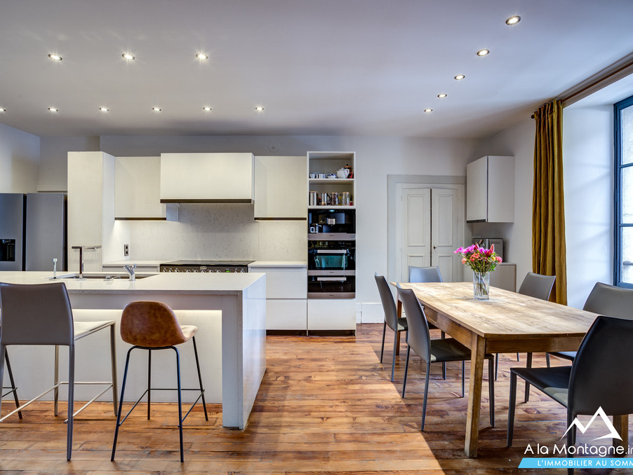 Au premier étage, vous trouverez une immense cuisine familiale donnant accès à un vaste salon avec poêle à bois, hauts plafonds et parquet d'origine restauré. Le salon donne sur un joli balcon en pierre avec une table de bistrot et des chaises. Une salle de jeux pour enfants partant de la cuisine et un bureau qui pourrait aussi devenir une chambre avec salle de bain.